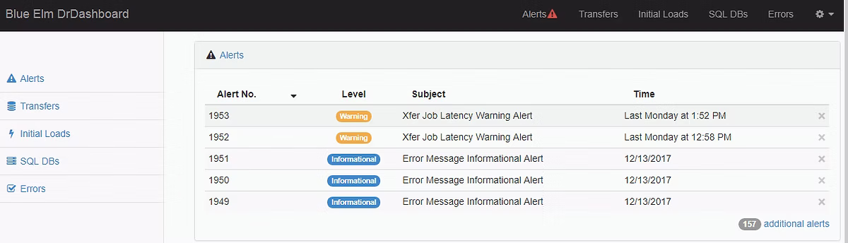Alerts are displayed across the top of the UI and are emailed to one or more recipients. These alerts are custom tailored to your specific MEDITECH environment. Alerts are typically “critical” messages letting you know if something is wrong with the DR transfer process or the storing of data (e.g., database our of space).