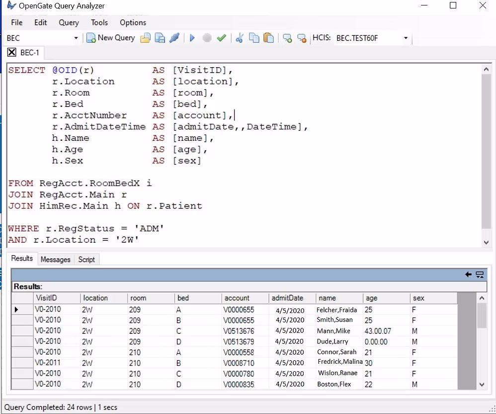Query Analyzer makes use of OpenGate and allows for the development of queries with its extremely helpful toolset. This includes a schema browser for searching through the MEDITECH schema and examining data relationships.