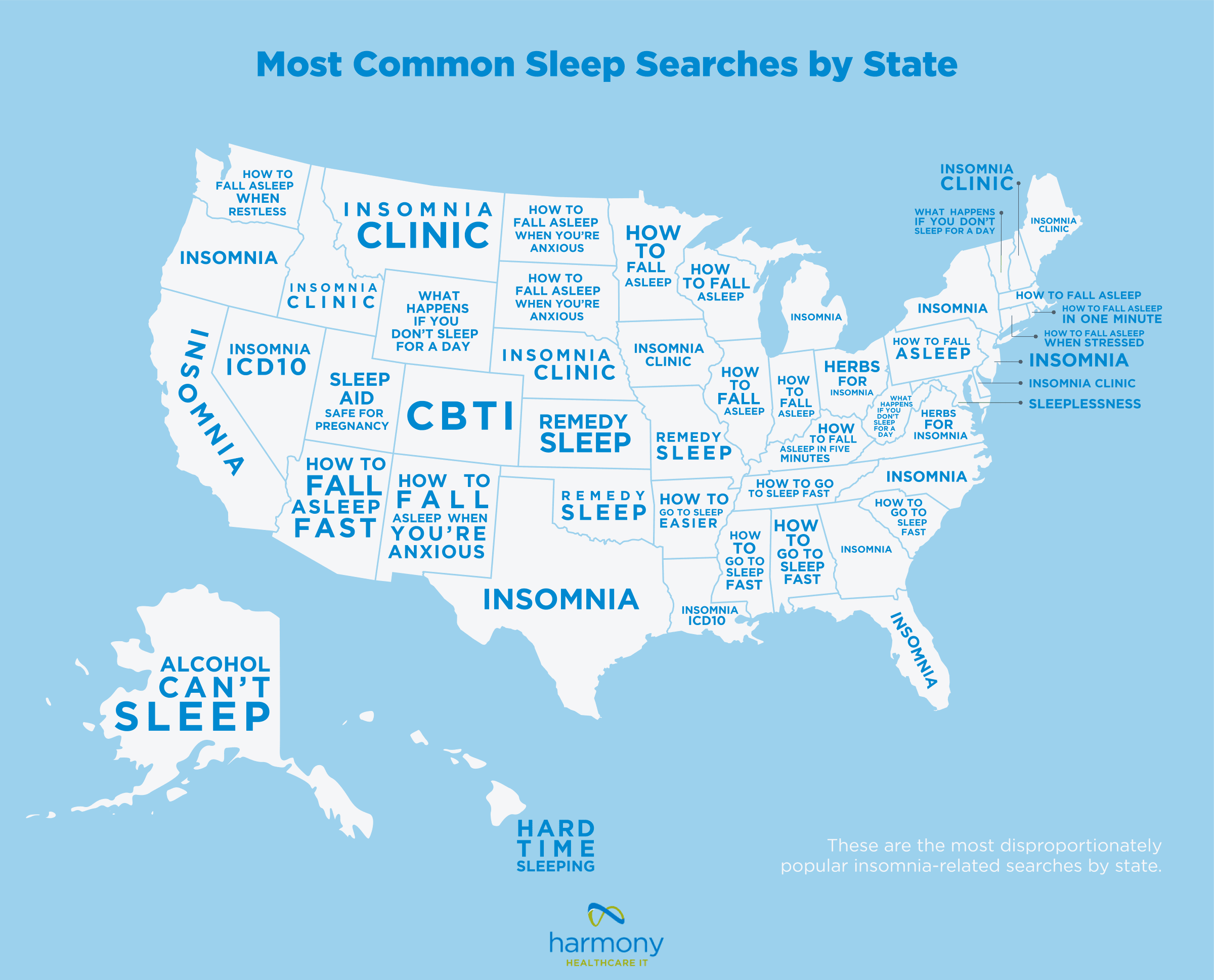 Insomnia is the most disproportionately popular search term in nine states including New York, California, and Texas. Stress and anxiety also played a big role in searches. People in Connecticut searched “how to fall asleep when stressed,” and the most searched phrase in New Mexico, North Dakota and South Dakota was “how to fall asleep when you’re anxious.”