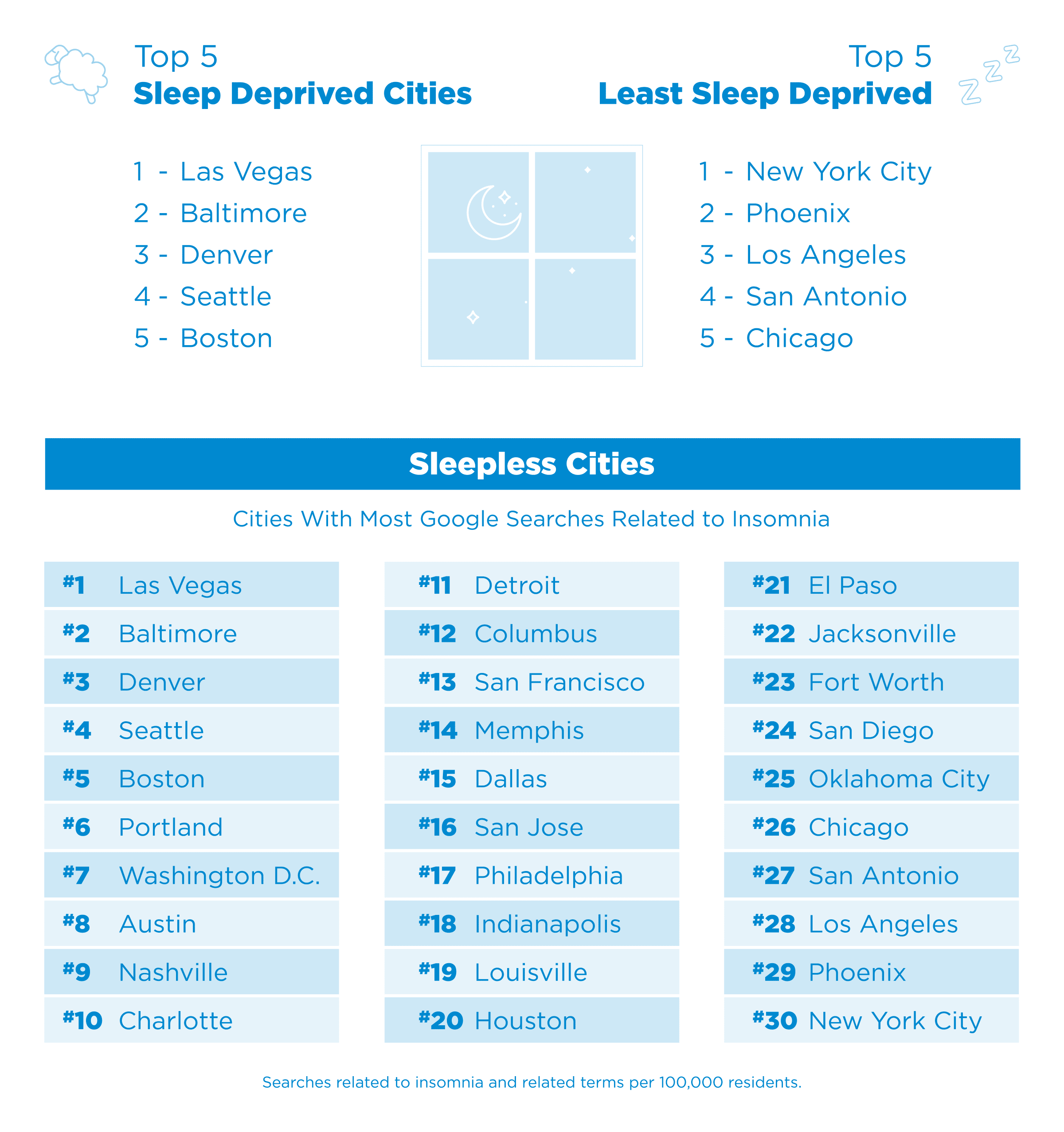 It looks like all those lights, shows, and casinos in Las Vegas are not helping anyone win the jackpot when it comes to sleep. Of the 30 most populous cities, Las Vegas searched about sleep issues the most. It was followed by Baltimore (2nd) and Denver (3rd).