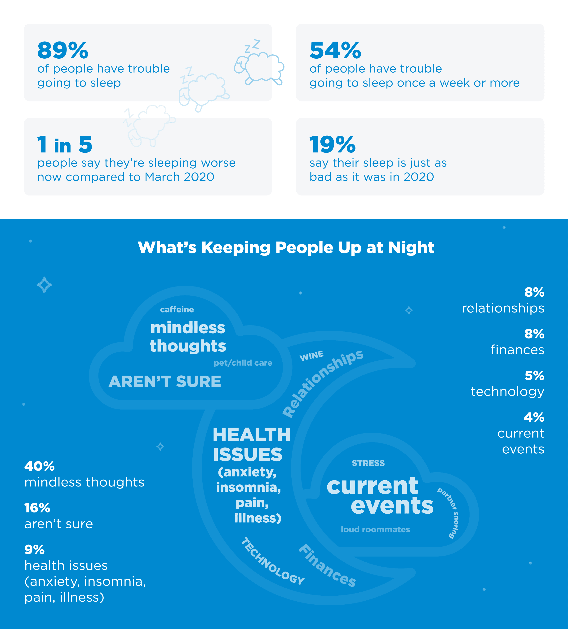 Survey respondents admitted the noise in their head is keeping them up most at night. Two out of five said mindless thoughts are to blame for their sleep struggles. But others (16%) frustratingly aren’t sure why they can’t get some shut eye.