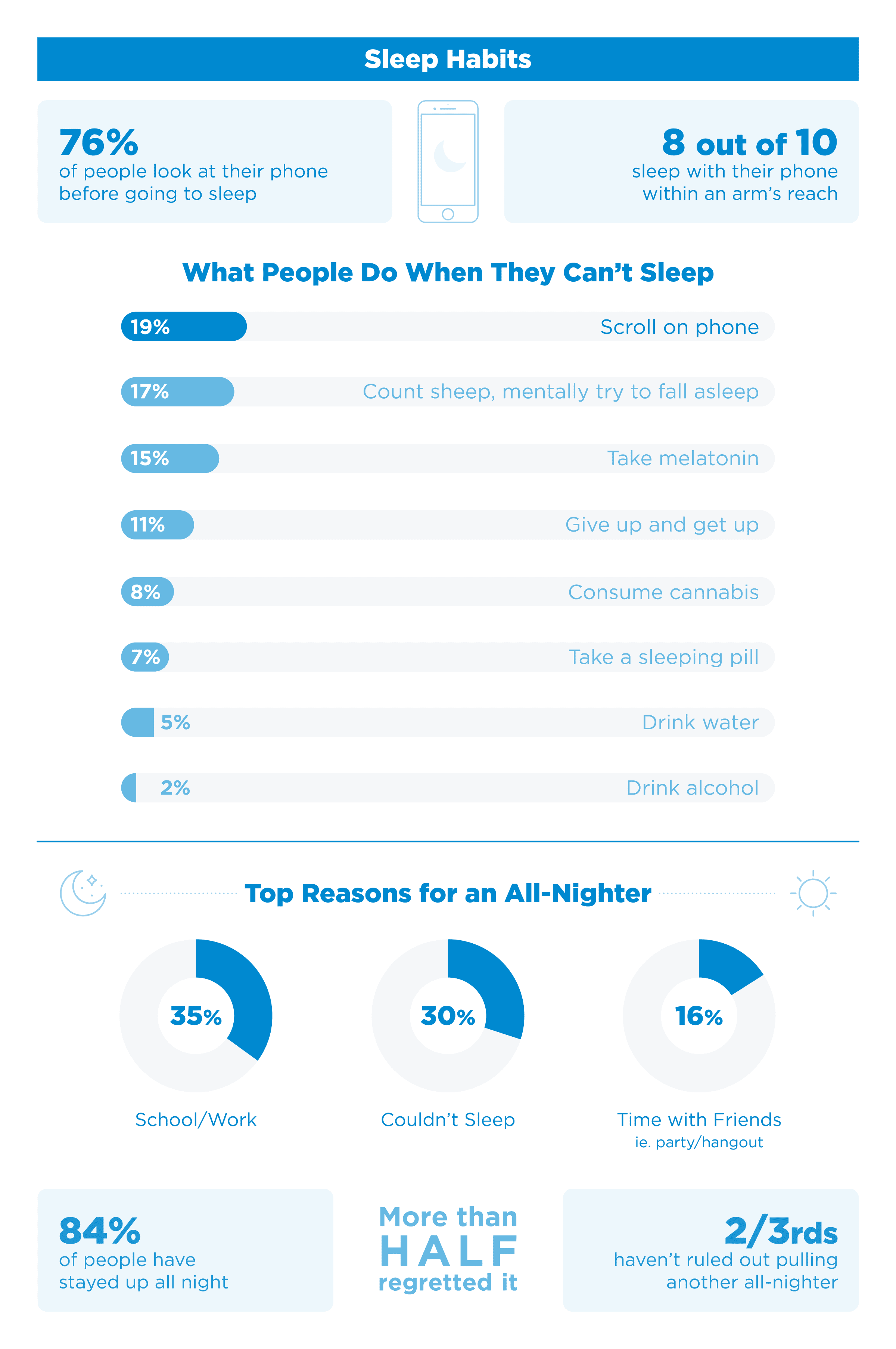 The majority of people surveyed have pulled an all-nighter, and more than half of people did it on purpose! The main reason for pulling an all-nighter was because of school or work. Unfortunately, another 30% just couldn’t sleep. Others (16%) admitted they were spending time with friends at a party or hangout.